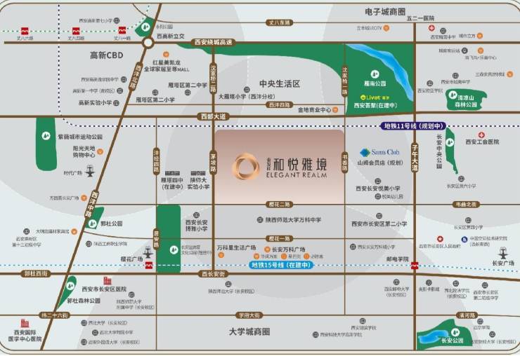 城南发展金线一一西部大道板块,西邻高新CBD,东接曲江CCBD.南靠长安大学城,多区价值叠加赋能。板块内更集萃生