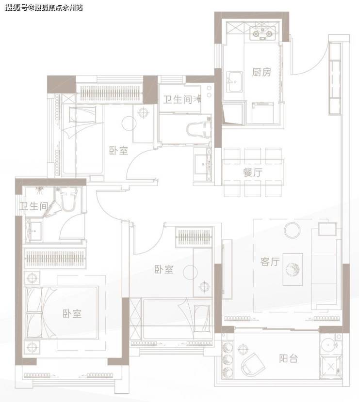 此外,该户型的L型厨房多元功能合理配置,三卧室均带飘窗,大大提高了空间利用率