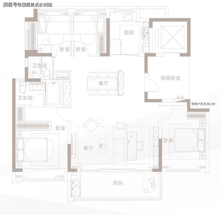 125㎡四房两卫户型:奢阔大平层,独梯入户,彰显尊贵。超长横厅,南北通透格局,三面采光,风景相融,为居住者带来极致的居住体验。