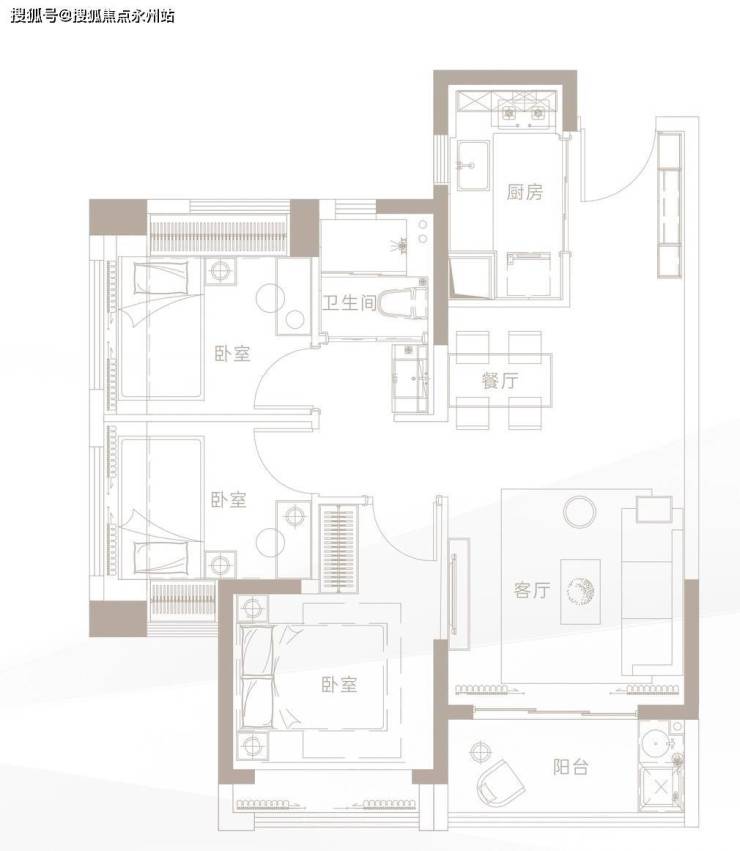 79㎡三房一卫户型:三面采光格局,让整个空间明亮通透。L型厨房设计合理,操作方便。双面采光卧室,为居住者带来明媚的起居环境。
