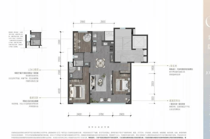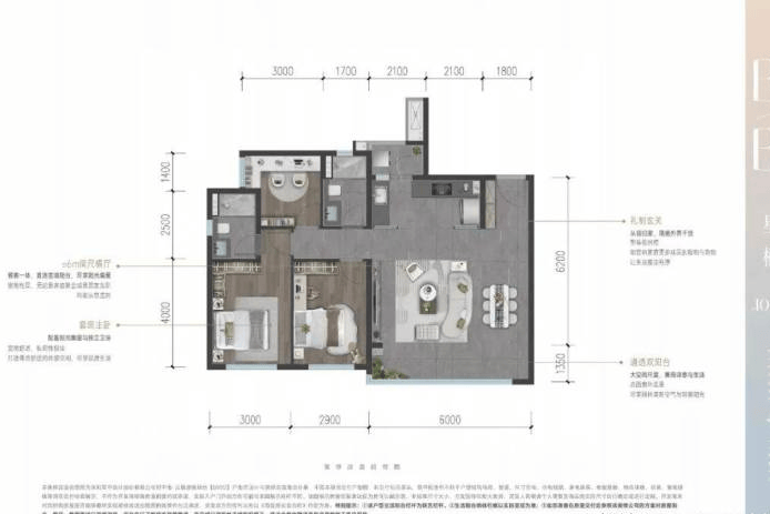 100㎡套三双卫户型:户型虽面积稍小,但布局精巧,三间卧室温馨舒适,双卫设计周到贴心,性价比突出。