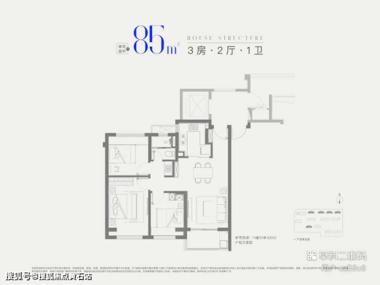 ● 85㎡三房一卫(二/三期):总价320万起,两梯四户(有连廊),户型方正全明,南北通透,三开间朝南+短进深,采光通风俱佳,适配新婚家庭或三口之家。