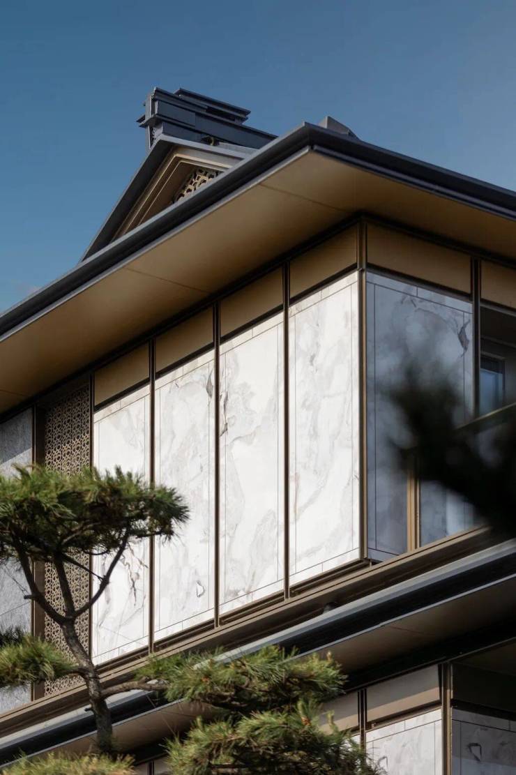 例如外立面采用海棠金镂格珊搭配白玉画屏岩板和印度宝蓝石石材,这一“金”一“白”,一“繁”一“简”,融合了中国传统工笔画对细节的极致雕琢与水墨画“计白当黑”的留白意境,而印度蓝宝石的中性色调,又巧妙平衡了这两种截然不同的美学风格,让产品在视觉上达到平衡和谐。