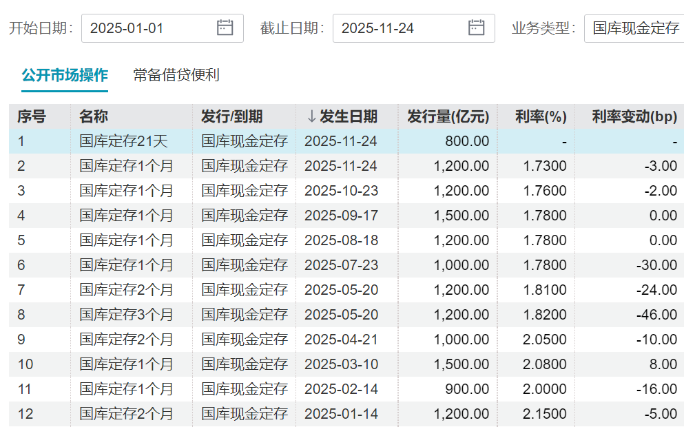 财政部、中国人民银行于2025年11月24日以利率招标、多重价位中标方式进行了2025年中央国库现金管理商业银行定期存款(十二期)招投标。该期中标总量为800亿元;期限为21天,起息日为2025年11月24日,到期日为2025年12月15日。