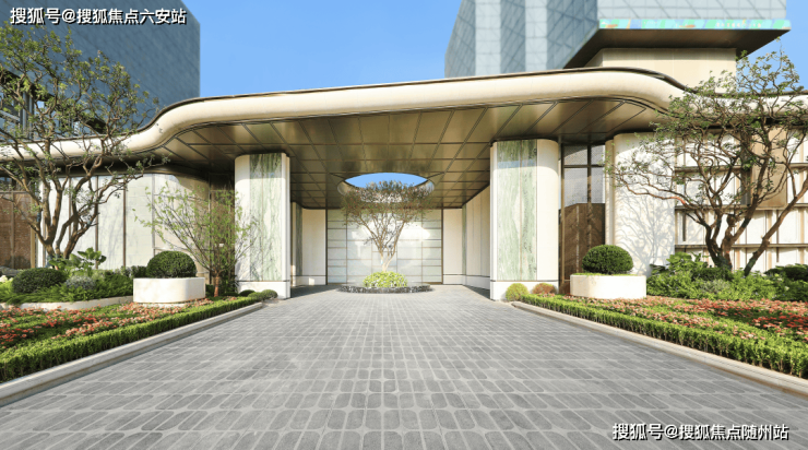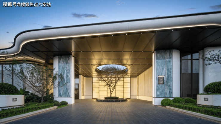 社区主入口是宽约80米、高约7.1米的超宽幅门头,两侧的维多利亚绿奢石以及中央的白雪公主透光石营造出归家仪式感,中央栽植的约60年树龄紫薇树更添艺术氛围。