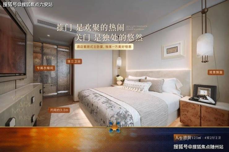 主卧以酒店套房标准,配备独立卫浴、衣帽间与观景飘窗,是二人世界的专属领域;