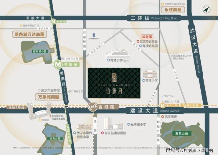 这里“三横”“三纵”“三轨”交通主干道交错:建设大道、发展大道、解放大道直通三镇,青年路、香港路、武汉大道贯通大汉口,香港路站(3/6/7号线)三轨交汇;