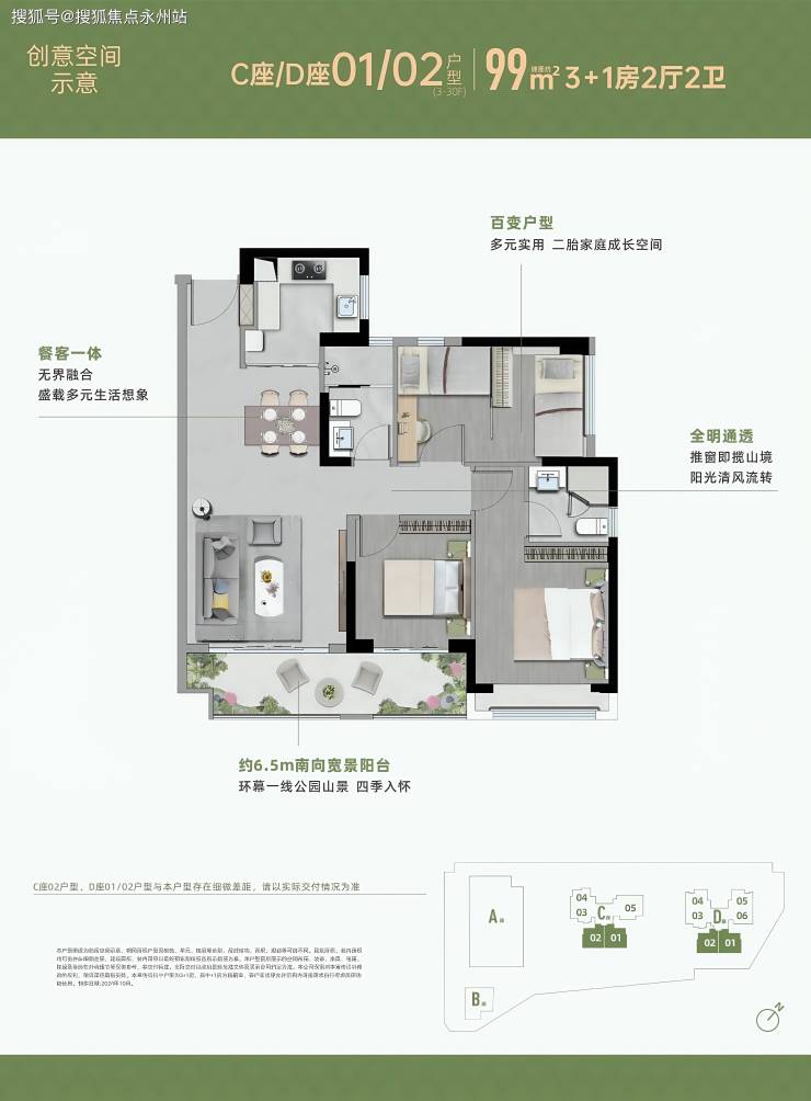 99㎡ 三+1房两厅两卫:三开间朝南,南北通透,客厅连接6.5米南向阳台,主卧270°观景视野,次卧可改房中房,U型厨房,得房率约90%。