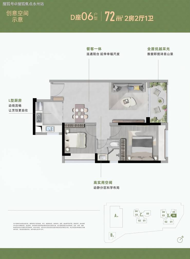 72㎡ 两房两厅一卫:竖厅设计,客厅开间3.5米,LDKB一体化(客厅+餐厅+厨房+阳台一体化),卧室宽度2.7-3.1米,东北朝向,得房率约90%(含赠送面积)。