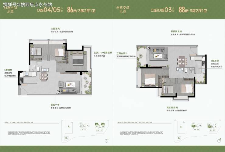 86㎡:卧室宽度2.65-3.2米,东北/西南朝向,L型厨房,干湿分离卫浴。
