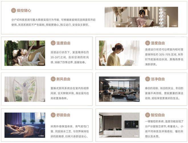 可以进行分户分室调节、自主操控,最大限度实现行为节能,同时还可一键远程智控,提前为老人小孩定制专属舒宜空间环境。用科技打造“自由随心”的家,打破季节限定,回归生活本身。