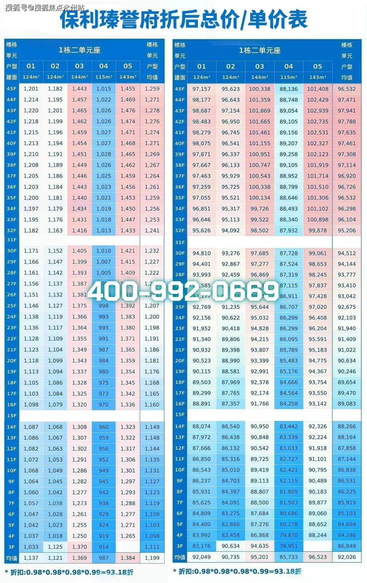 价格区间:备案均价9.99万/㎡,折后均价约9.4万/㎡,折后总价972万-1509万/套,单价8.45-10.49万/㎡。约9.413折优惠,折后总价较备案价最高直降128万。