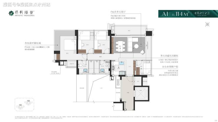 建面约114㎡4房2厅2卫:独门独户,全明独立入户电梯厅,私密又便捷的归家仪式感。该空间合计约9.4平,户型三面采光,客厅、阳台、主卧270°景观面!