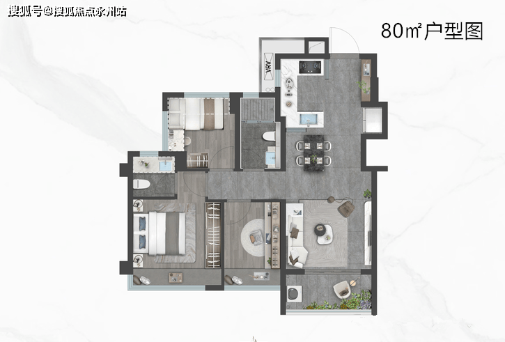 80㎡的3房2厅1.9卫:设计的是竖厅格局,客厅开间3.4米,LDKB一体化,S墙设计预留冰箱位,U型半开放式厨房,创新式1.9卫设计,得房率:78.99%(不含赠送),有西北、西南、东北、东南4个朝向。