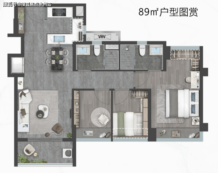 89㎡的3房2厅2卫:设计的是新版竖厅格局,客厅开间3.5米,LDKB一体化,S墙设计预留冰箱位,约11米四面宽超幕视野,主卧套房带衣帽间,U型全开敞厨房,得房率:78.99%(不含赠送),有西北、西南、东北、东南4个朝向。