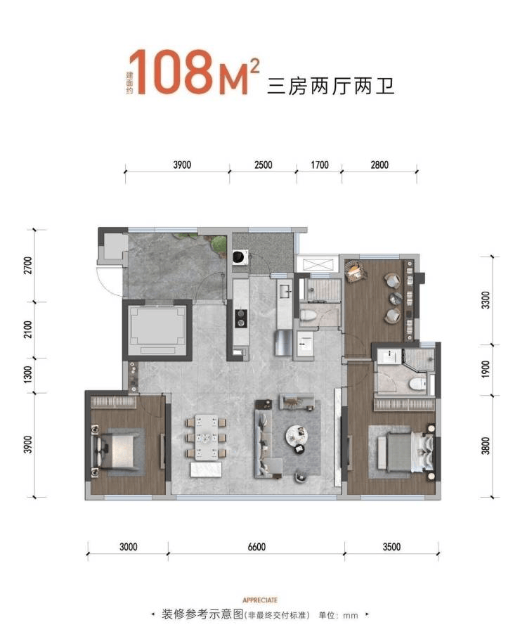 108㎡三室两厅双卫