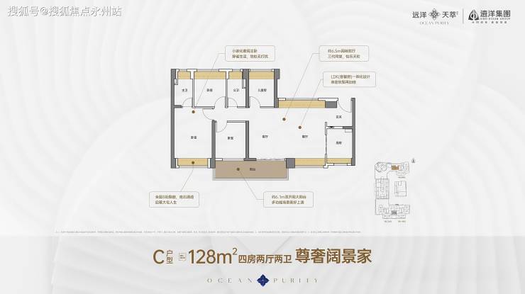 竖厅格局,客厅3.5米开间,LDKB一体化,S墙设计预留冰箱卡槽位,客厅连接次卧出5.9米长的大阳台,主卧双面飘窗,次卧270°转角飘窗,全屋6面飘窗,U型厨房,卫生间干湿分离。