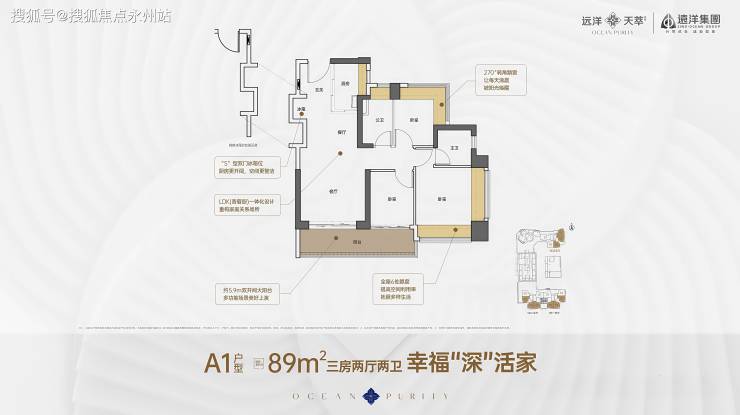 A1户型-约89㎡3房2厅2卫:户型分布在1、2、5单元,阳台南向、东向、西向