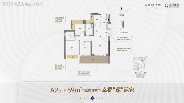 A2户型-约89㎡3房2厅2卫:户型分布在1、2、5单元,阳台南向、东向、西向