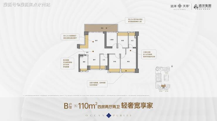 B户型-约110㎡4房2厅2卫:户型分布在1、2单元,竖厅南北通透格局