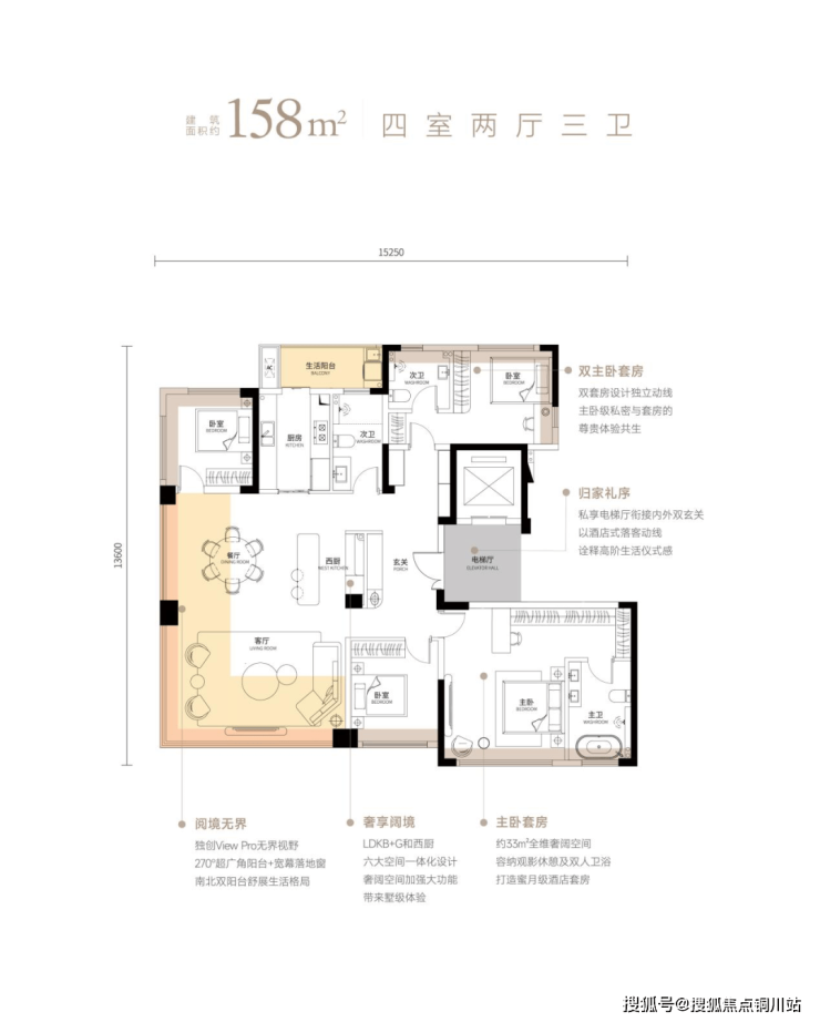 另外,独立电梯前室、全屋360°采光,主卧、北向次卧270°视野