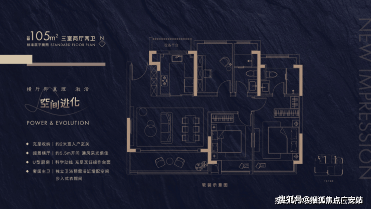设计:大横厅(最大7.2米开间)、270°飘窗、双明卫,105㎡户型得房率高