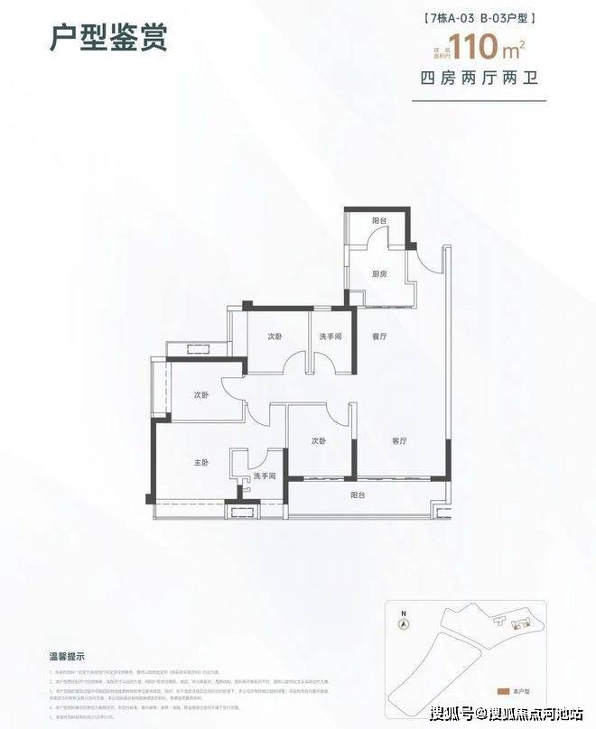 110㎡的4房2厅2卫,设计的是经典竖厅格局,进门入户玄关,LDKB一体化设计,四开间朝南,动静分区,客厅连接次卧出大阳台,L型厨房还带1个生活阳台,卫生间干湿分离,得房率约82%(不含赠送),东南朝向。