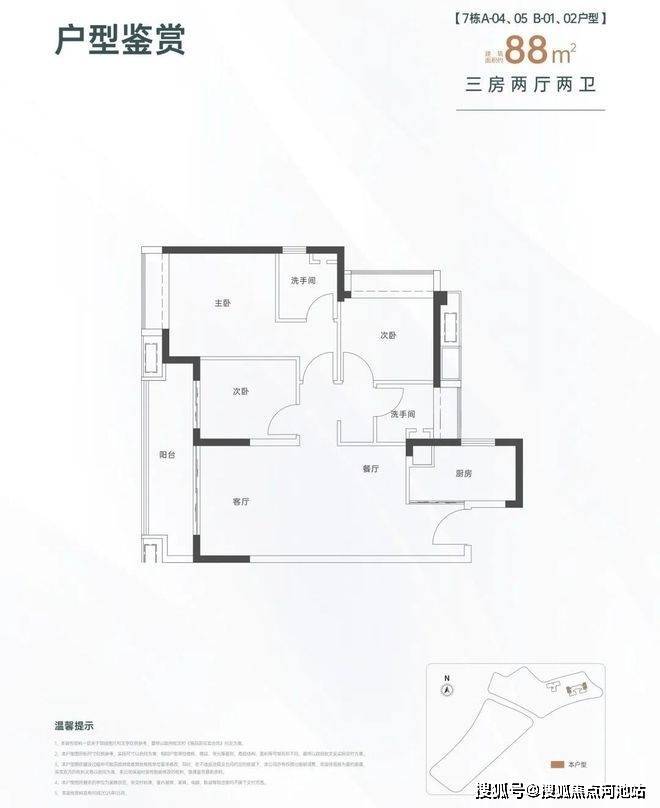 88㎡的3房2厅2卫,设计的是经典竖厅格局,进门入户玄关,LDKB一体化设计,动静分区,客厅连接次卧出大阳台,L型厨房,公卫三段式分离,得房率约82%(不含赠送),西南或东北朝向。