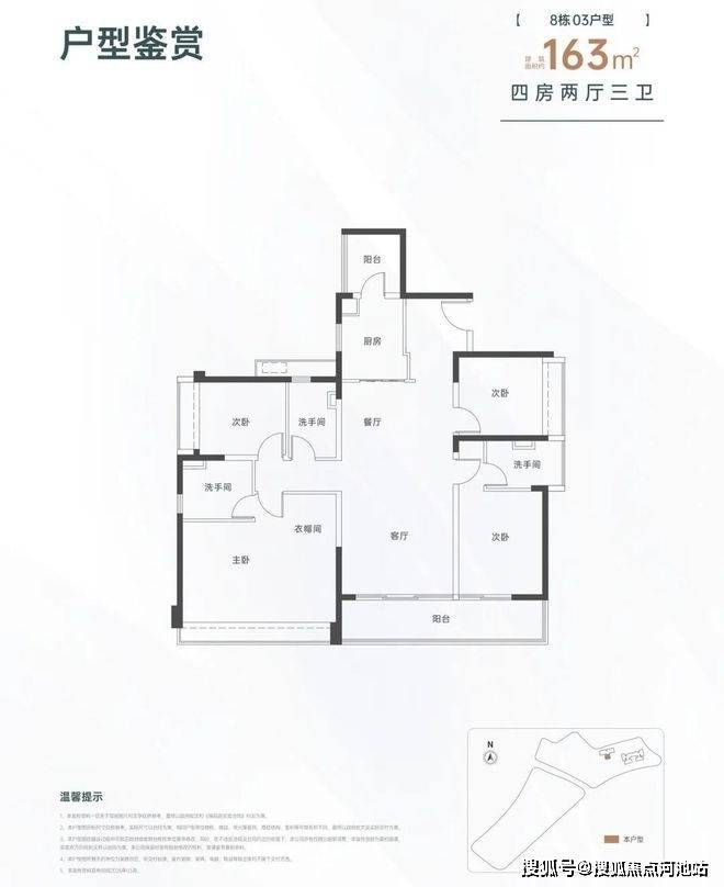 163㎡的4房2厅3卫,设计的是竖厅格局,一梯一户,进门入户玄关,LDKB一体化设计,三开间朝南,双主卧套房,客厅连接次卧出大阳台,L型厨房还带1个生活阳台,卫生间干湿分离,得房率约82%(不含赠送),东南朝向。
