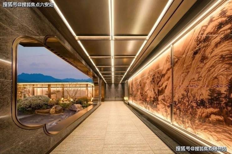 社区主大门以盛唐建筑至高形制——庑殿顶为蓝本,宽约30米,高约6.7米,采用不锈钢材质打造,由百名工匠历时5个月精工细作,投入近千万资金。入口处嵌入双层夹绢玻璃工艺的富春山水图,两侧配以照壁、水池及精选罗汉松,营造归家礼仪的磅礴氛围。