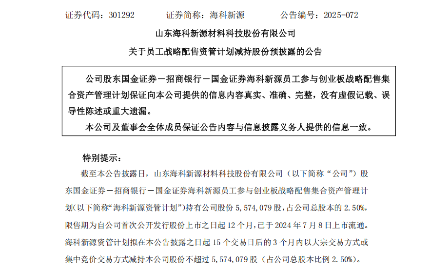 海科新源发布公告称,国金证券—招商银行—国金证券海科新源员工参与创业板战略配售集合资产管理计划(以下简称海科新源资管计划)拟减持公司2.50%的股份,公司董事张在忠、董事吴雷雷拟分别减持公司不超过0.0564%、0.0130%的股份。