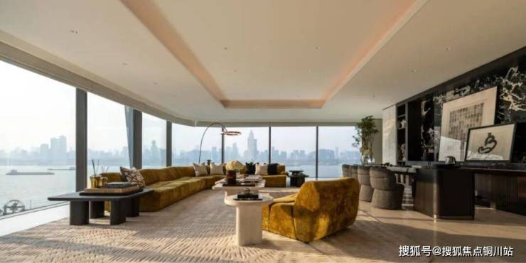 室内无柱、取消角柱的设计,让长江天际实现了尺度最大、视线最优的奢阔景观和居住感受。方正无柱的家庭公区空间,也让室内设计布局更为灵活,诸如沙发区、茶室、吧台区、宴饮区和第三空间等5大复合场景,可通过洄游动线进行串联,让每个场景保留独立性的同时,也让场景之间的切换更具礼序感和趣味性,社交会客和家庭欢聚,在此从容兼顾。