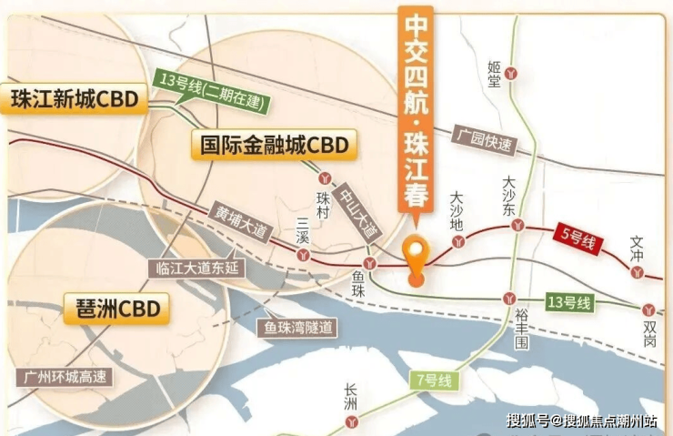 中交四航.珠江春距离地铁5号线鱼珠站和大沙地站双地铁站约800米,目前就能通过地铁5号线直达金融城、珠江新城,未来13号线二期开通后,也通过鱼珠站直抵珠江新城。自驾出行的话,除了鱼珠隧道、临江大道东沿线可以直通珠金琶,还有黄埔大道、中山大道等核心主干道。