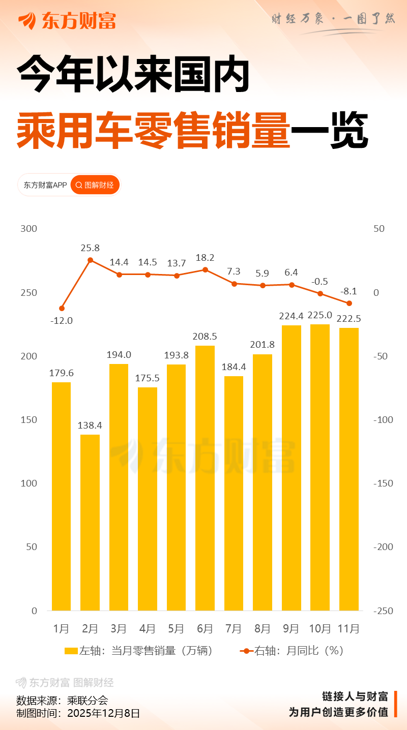 乘联分会:11月全国乘用车市场零售222.5万辆 同比下降8.1%