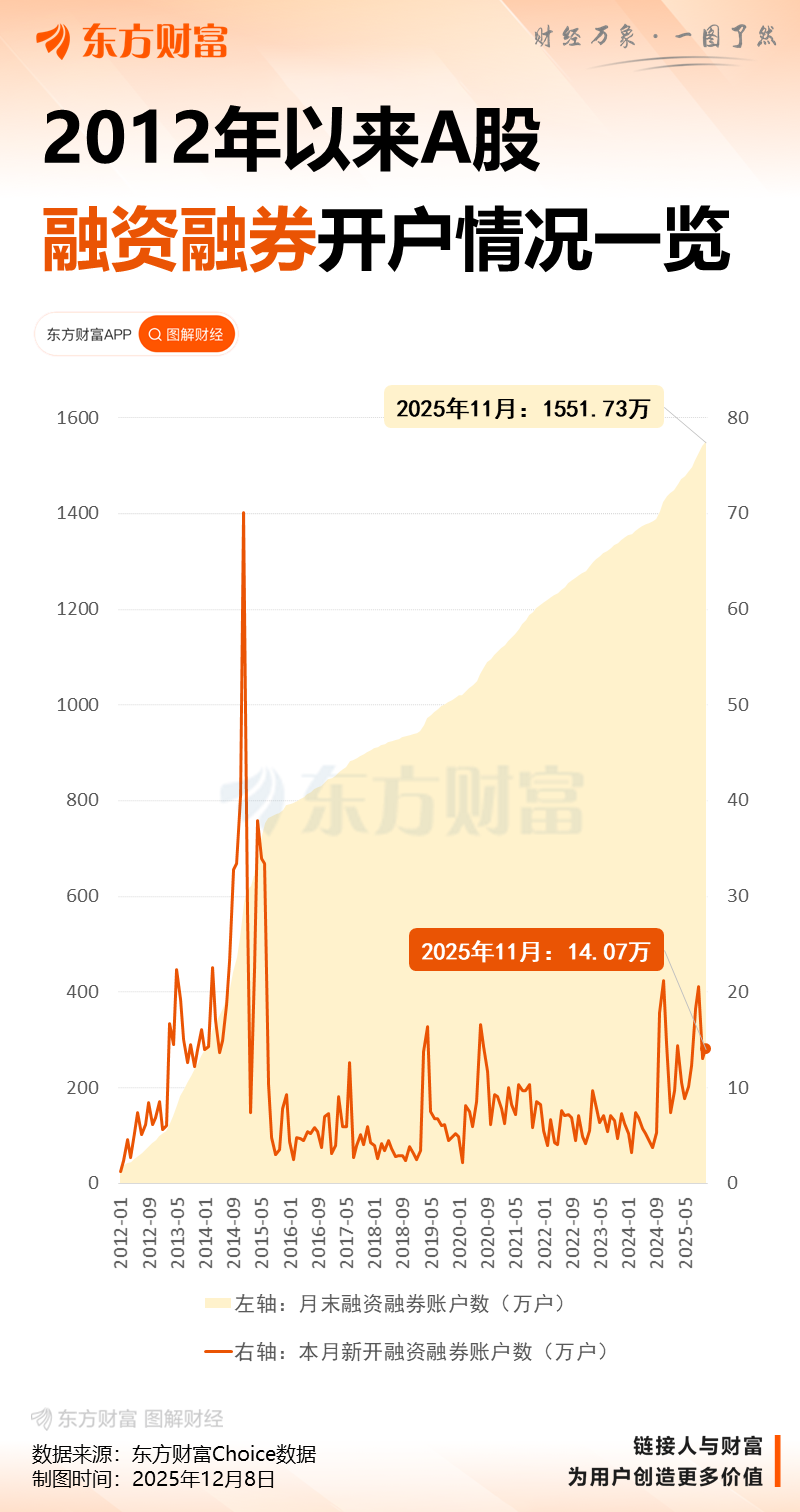 从2025年的月度数据明细来看,两融新开户数呈现明显的起伏:1月新开7万户;2月升至9.74万户;3月达到一个小高峰14.45万户;4月回落至10.59万户;5月进一步降至8.87万户;6月回升至10.14万户;7月继续增长至12.36万户;8月大幅跃升至18.3万户;9月则达到年内迄今的高点20.54万户,10月的回落至13.02万户,可视作在连续两个月高增长后的正常调整,而11月则反弹至14.07万户,整体仍处于今年以来中高位水平。