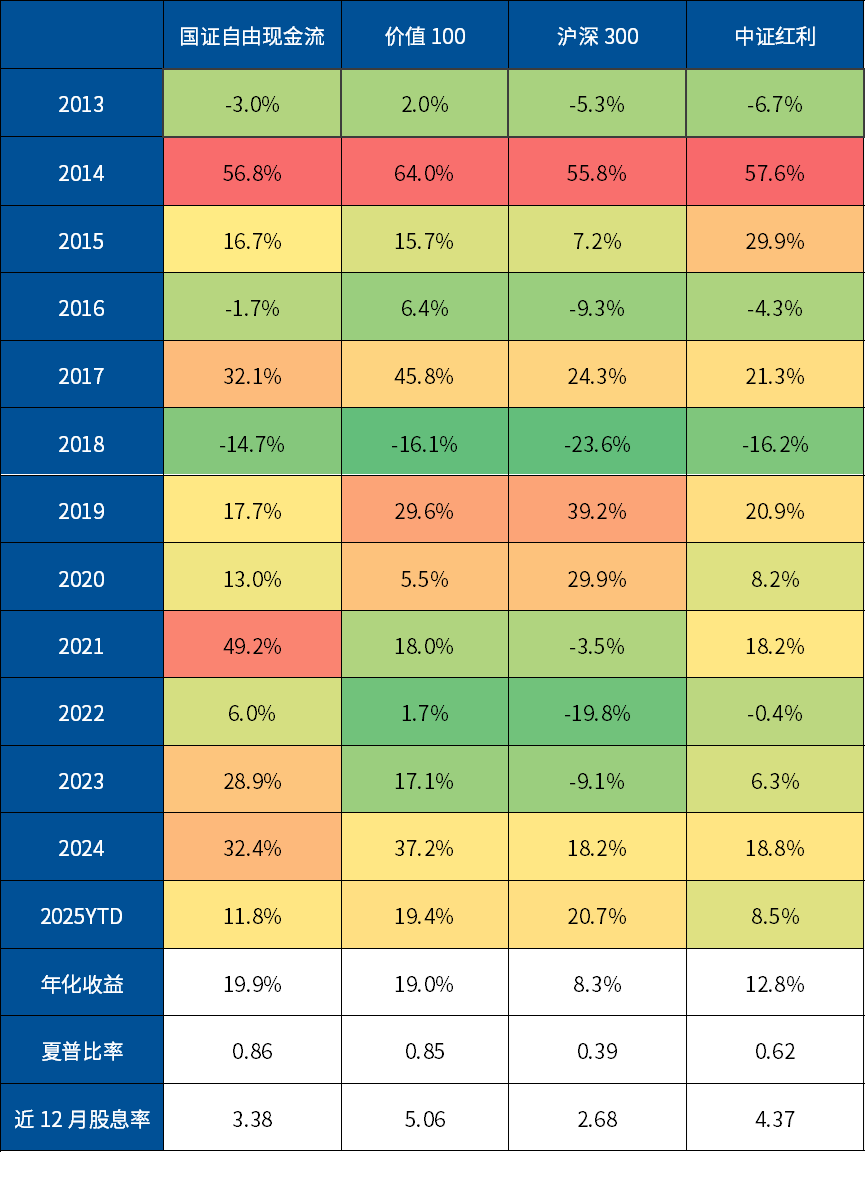 国证自由现金流指数以自由现金流率为核心选股指标,成分股兼具当下充裕的现金流与长期现金创造能力,且盈利水平持续较高,不仅能实现 “熊市抗风险、牛市稳增长”,未来分红回购潜力也更突出。长期收益亮眼:2013 年以来年化收益 19.9%,大幅跑赢中证红利的 12.8%,风险收益比0.86也远高于红利和沪深300;发布至今13 年中有10年录得正收益,特别在2021-2022 年市场下行期表现突出,为投资组合筑牢安全防线。