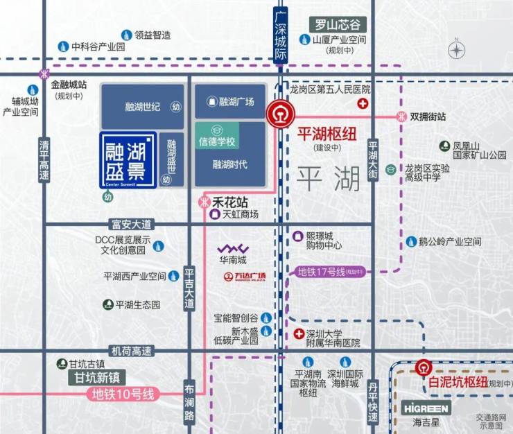 4地铁:项目距离10号线禾花站约500米(百度测距),连接坂田,直达福田中心区;另有规划中地铁17号线(直连罗湖口岸)/18号线(连通空港新城)/21号线(向西联系南山高新区、前海自贸区等高新区),通勤更高效;