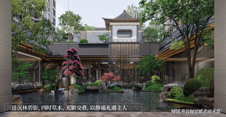 除了这些,包括观云具有宋氏风格的公建化立面、三进制归家礼序、下沉的山水庭院、国风园林、会所泳池健身房这些外化的豪宅卖点都是标配。并且,这是一个相对比较大的地块,园林体量是充足的,能够承接更有层次、更丰富的植被绿化和庭院小景,这一点其实非常重要,如果是小地块就会受到很大限制。