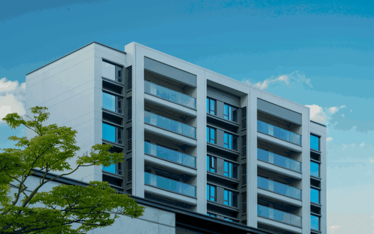 绍兴·玖樟台外立面,采用银灰色仿石材颗粒涂料,整体现代极简典雅风格,经典对称,搭配通透的玻璃,硬朗挺拔,成为沥海城区靓丽的风景线。
