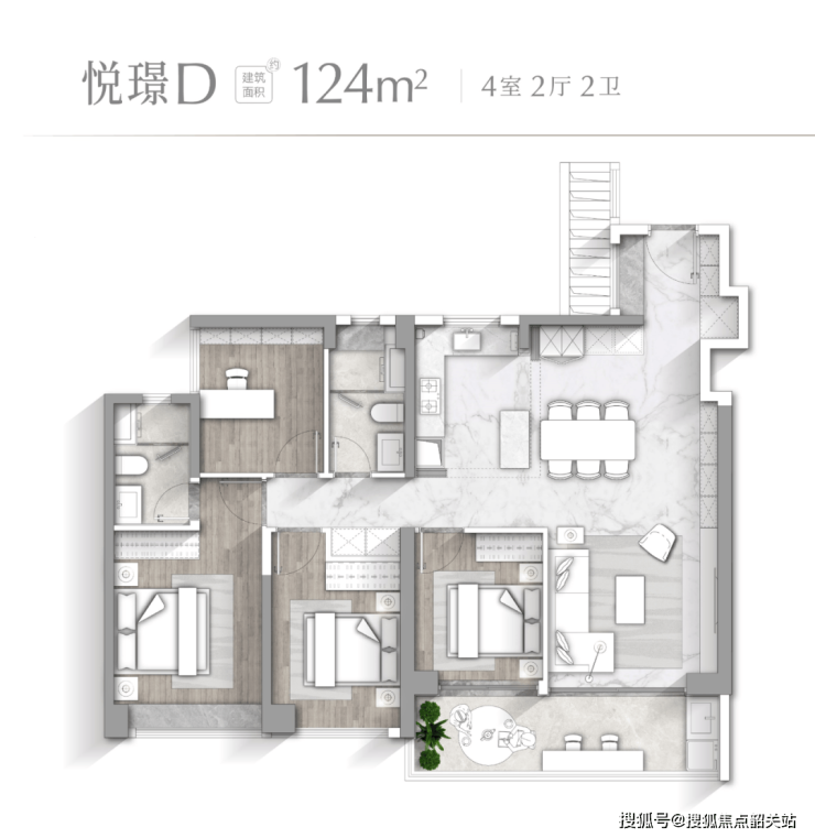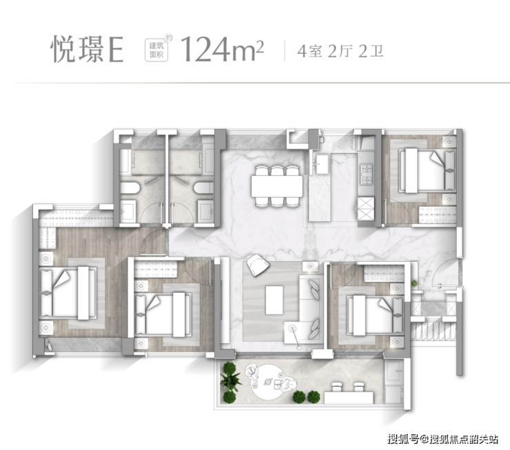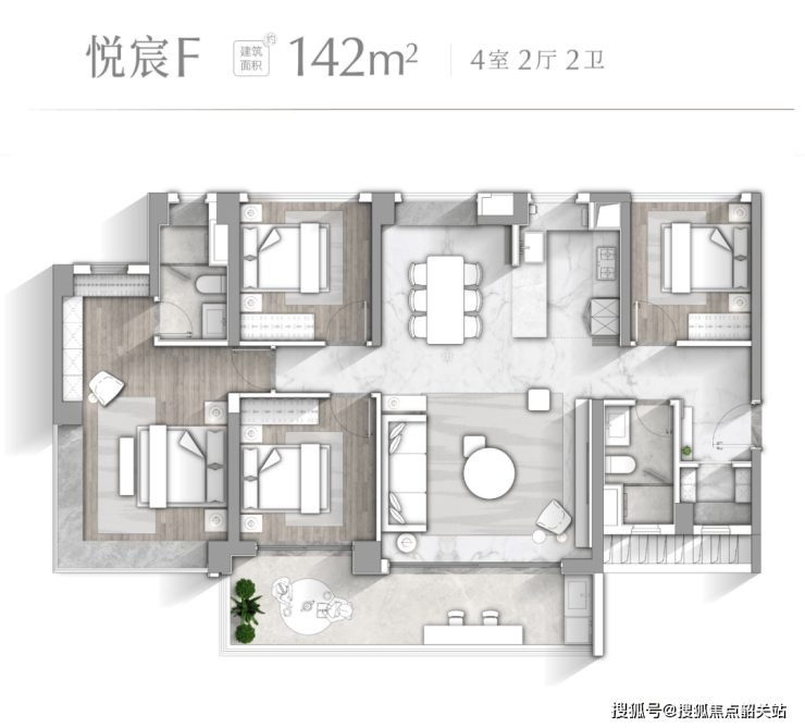 户型设计精细化,诸如悦宸F户型建面约142㎡,客厅开间约4.85米,南北通透,主卧三面窗270°采光,厅卧空间可灵活改造;悦璟B户型建面约124㎡,三南向卧室、半开放式中西厨设计,约6.6米双面宽阳台最大化景观视野。每一户型都兼顾采光、通风、舒适性及全生命周期使用需求,呈现高端豪宅体验。
