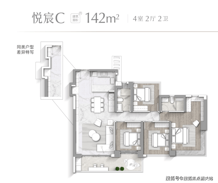 高端户型如悦宸C户型建面约142㎡,拥有超15米展宽,四开间朝南,巨幕采光面,南北对流主卧配三面窗270°采光;悦玺A户型建面约98㎡,全南向阳光三房,客餐厨一体布局,厅卧空间灵活,可连接约6.4米阳台,尊享私密天地。每一户型均体现豪宅尺度、功能舒适和景观价值,让生活品质达到顶级标准。