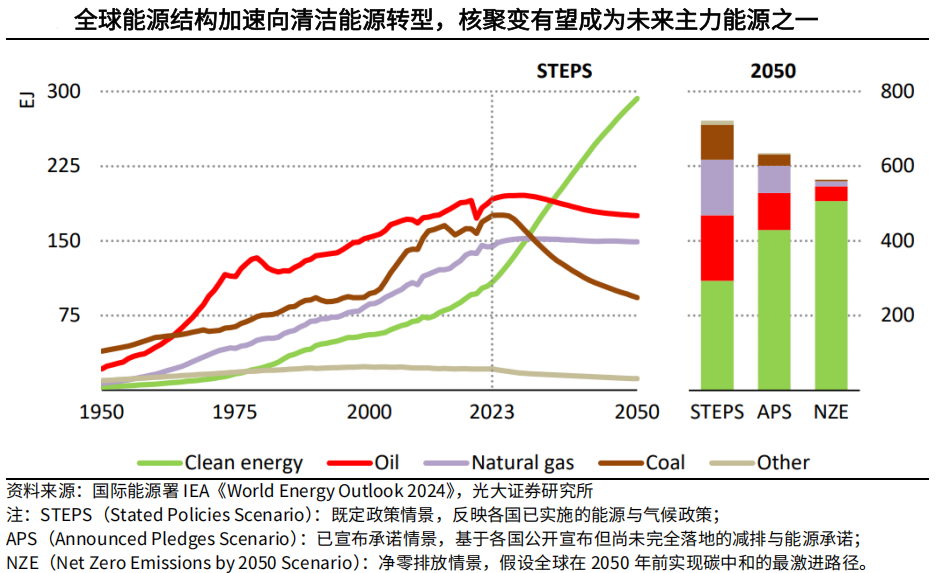 从全球能源结构趋势看,清洁能源已成为能源系统转型的主方向。国际能源署在《世界能源展望2024》中预测,风电、太阳能、核能等清洁能源将在2050年前持续增长并占据主导地位。在净零排放情景NZE中,清洁能源需求增长尤其迅猛,这一趋势为下一代零碳能源形态如核聚变提供了技术替代和系统整合的政策窗口与产业机会。