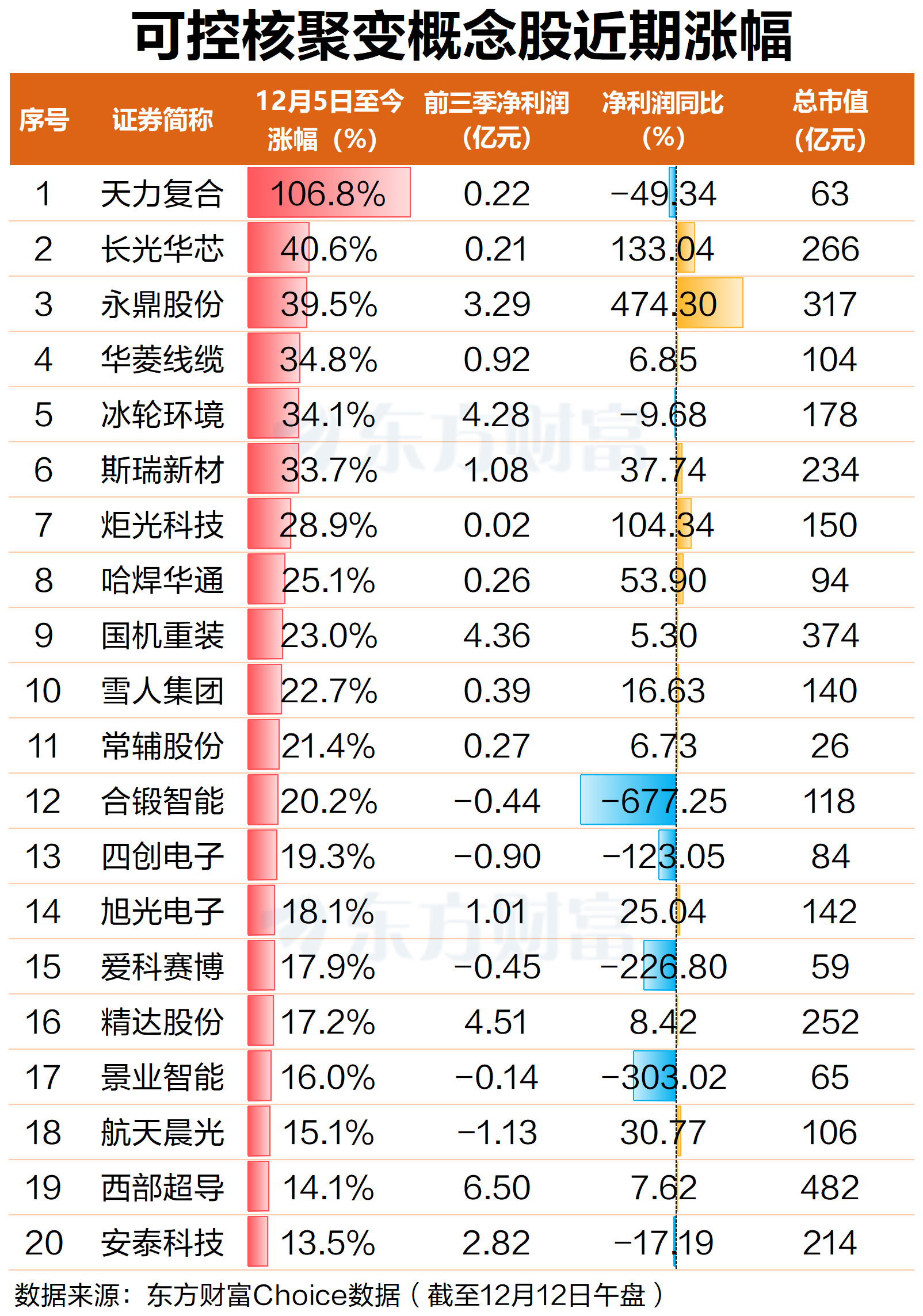 东方财富Choice数据显示,自12月5日以来,A股可控核聚变概念股66只成分股中有59股股价上涨,涨幅中位数高达9.8%。其中涨幅最大的股票是北交所的天力复合,达106.8%,股价在6个交易日里翻倍。此外,长光华芯、永鼎股份、华菱线缆、冰轮环境、斯瑞新材等多股,同期涨幅均超30%。