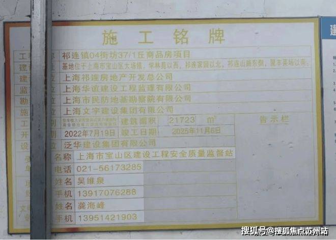 施工铭牌显示,该项目竣工日期为2025年11月,建设单位为上海祁连房地产开发总公司。