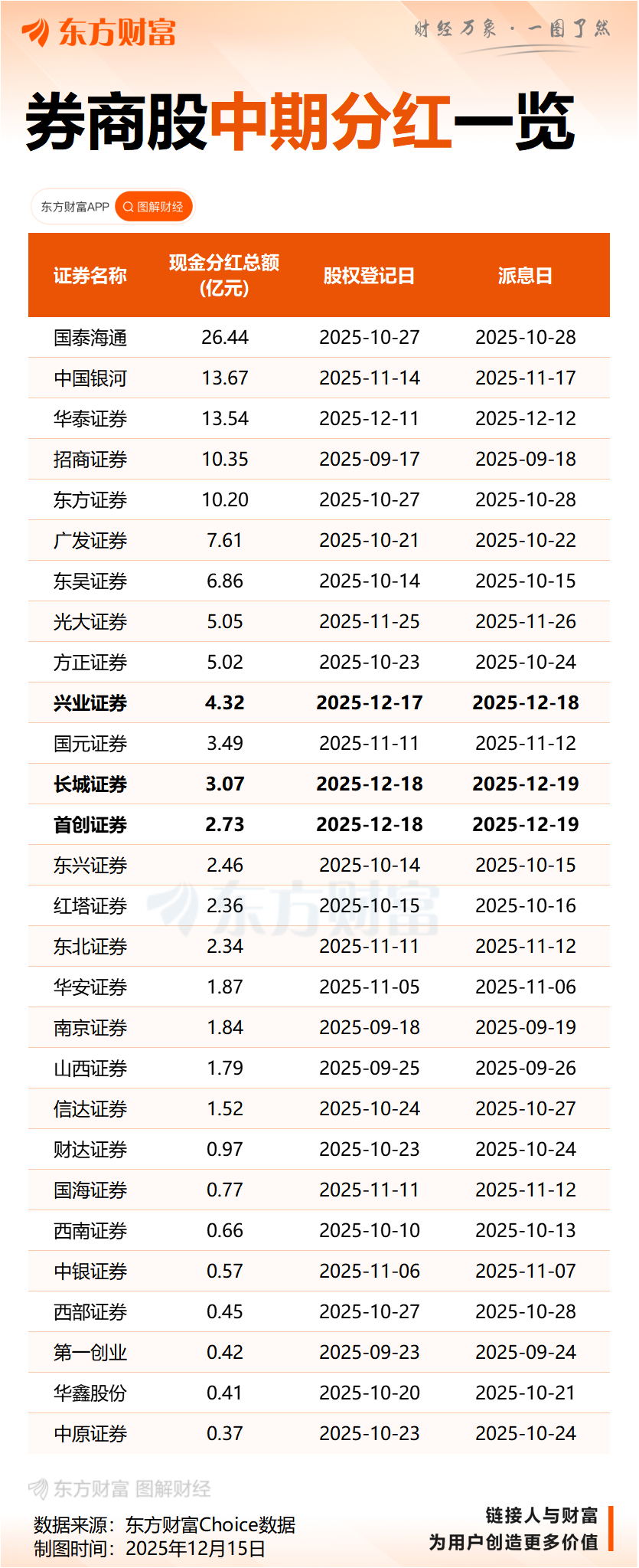 就在此前一天(12月11日)兴业证券也发布中期权益分派实施公告,该公司计划每股派发现金红利0.05元(含税),共计派发现金红利4.32亿元,派息日为12月18日。