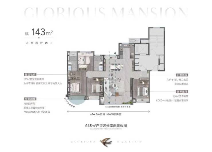 143㎡的四室两厅两卫户型采用了LDKG一体化设计,餐厅客厅阳台无缝连接,打造流畅的居家动线,为居住者提供更多共享空间。约11.3米南向超大面宽,双卧朝南,采光通风俱佳。主卧套房设计配备南向飘窗、独立卫生间、双衣帽柜,为居住者提供便捷、私密的居住体验。这种户型的设计不仅考虑到了居住者的生活需求,还充分利用了空间,让整个家庭都能够享受到舒适的生活环境。