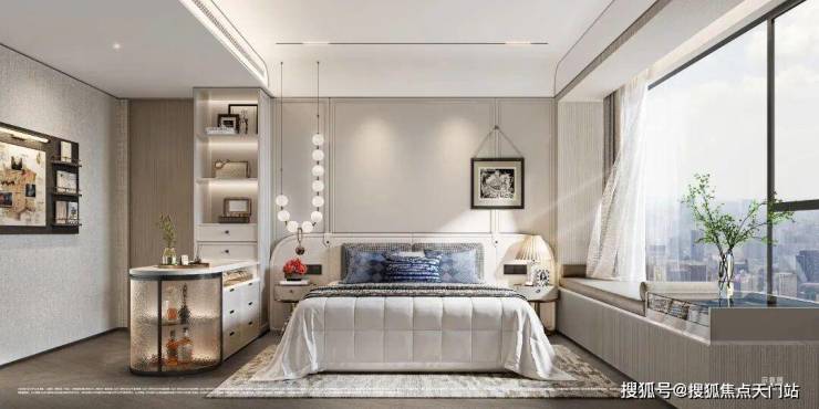 主卧套房尤其吸睛!以270°转角飘窗打破传统空间边界,配合双台盆、大尺度衣帽间等顶配细节,将奢华居住体验浓缩于每一寸空间。飘窗台延伸出的休憩区与窗外景观形成对话,让私密时光也充满诗意。