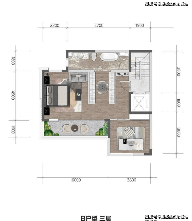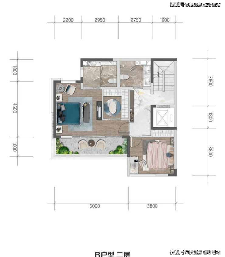 二层:两卧室布局,次卧套房设计,带大面积景观阳台,私密性较好;