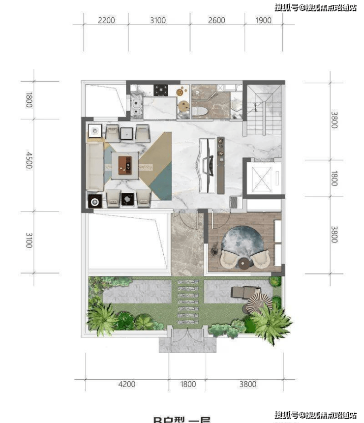 一层:入户花园,私家庭院设计,搭配超大客厅,美观自然;
