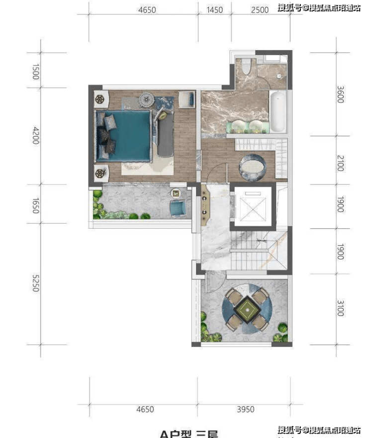 三层:豪华主卧套房设计,附带约4.7米开间阳台和约4米开间独立露台;